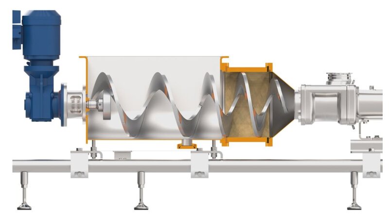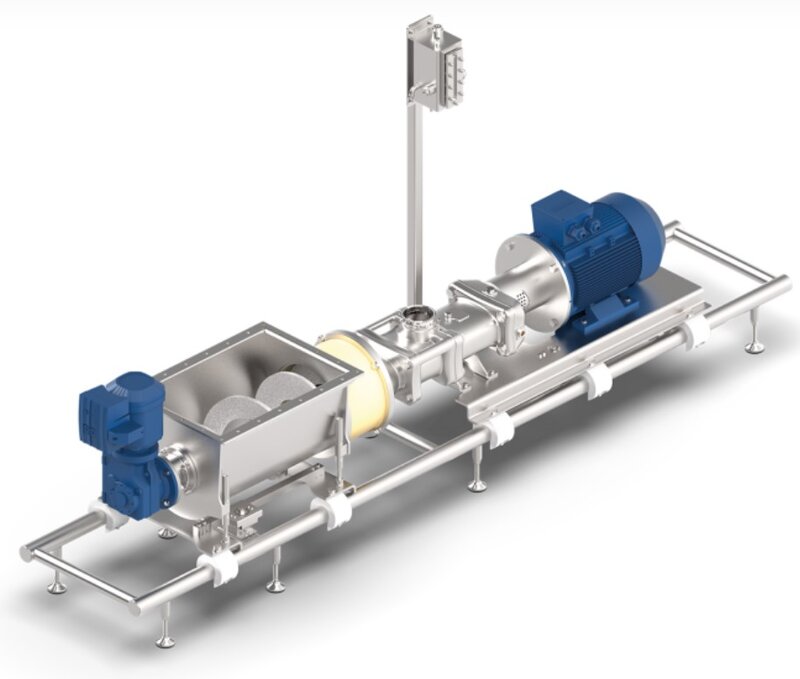 Schonend hochviskose Medien fördern: Die VarioTwin NG ist die hygienische und patentierte Ergänzung zur Twin NG Schraubenspindelpumpe. Es handelt sich um ein Zusatzmodul mit Rachen und Zuführschnecke.
